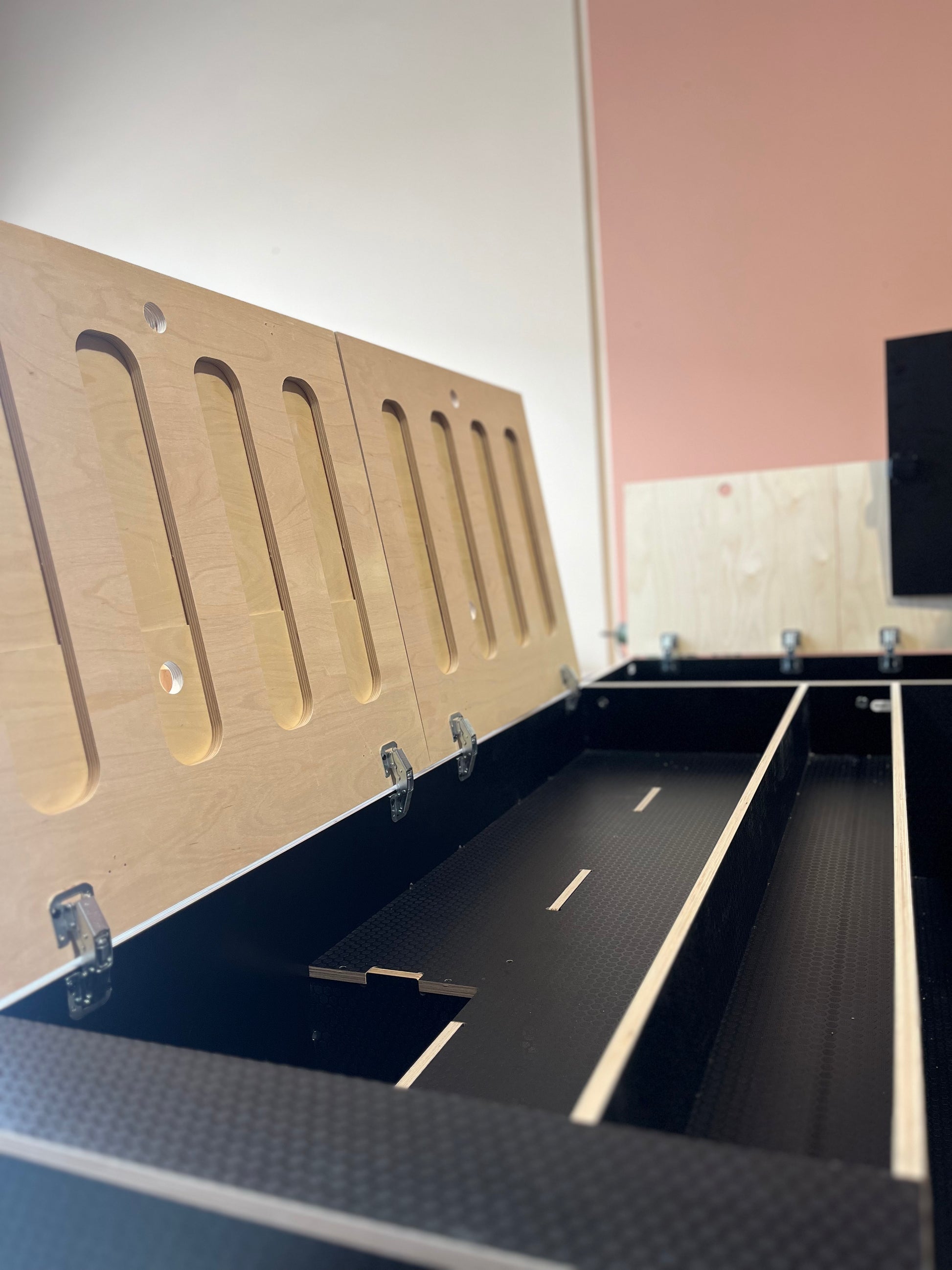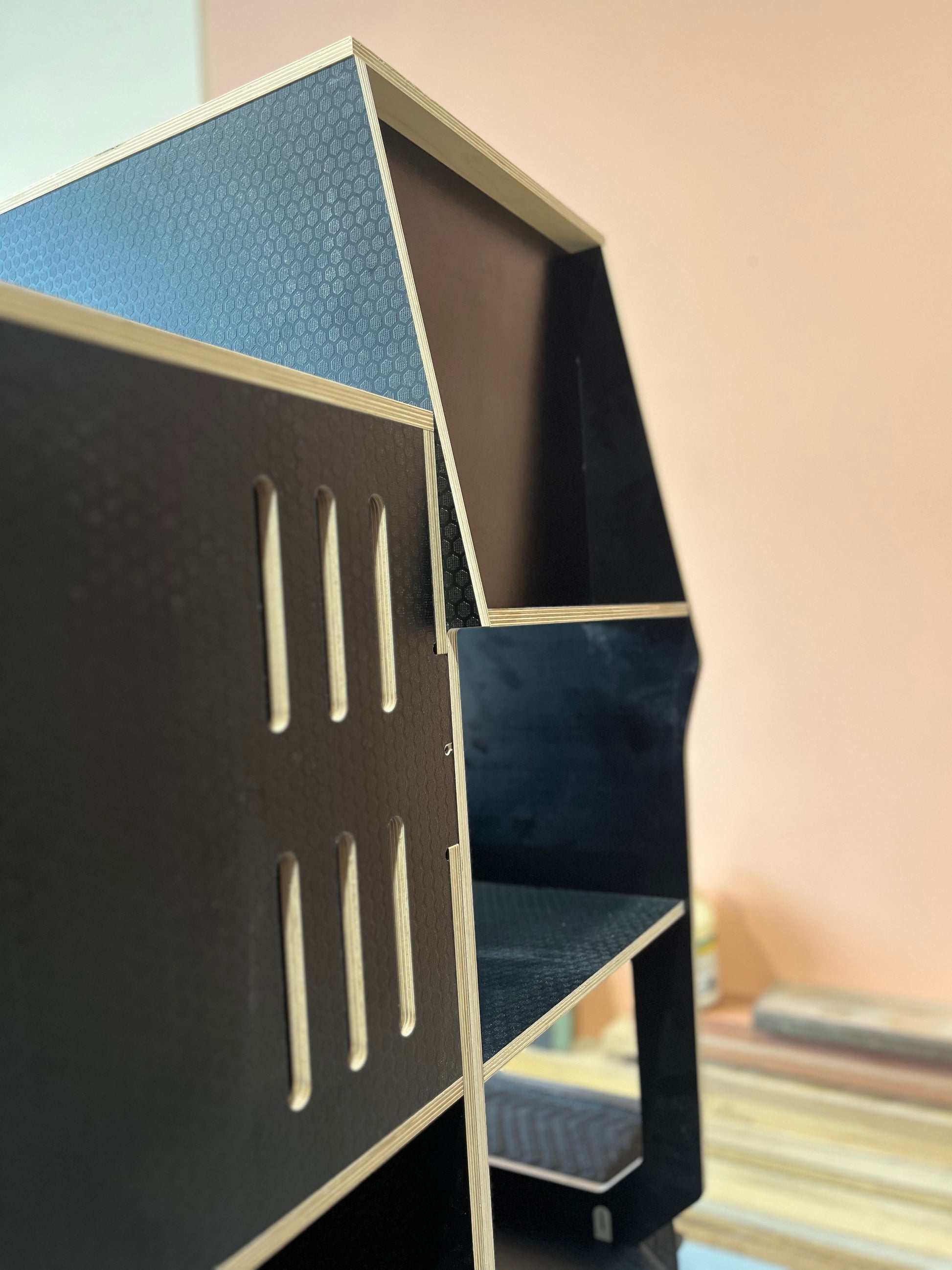 - Built from premium black hex face plywood. This plywood is designed as flooring and is an extremely durable material. The black hex finish looks great and is easy to maintain and keep clean. White and plain birch also available.